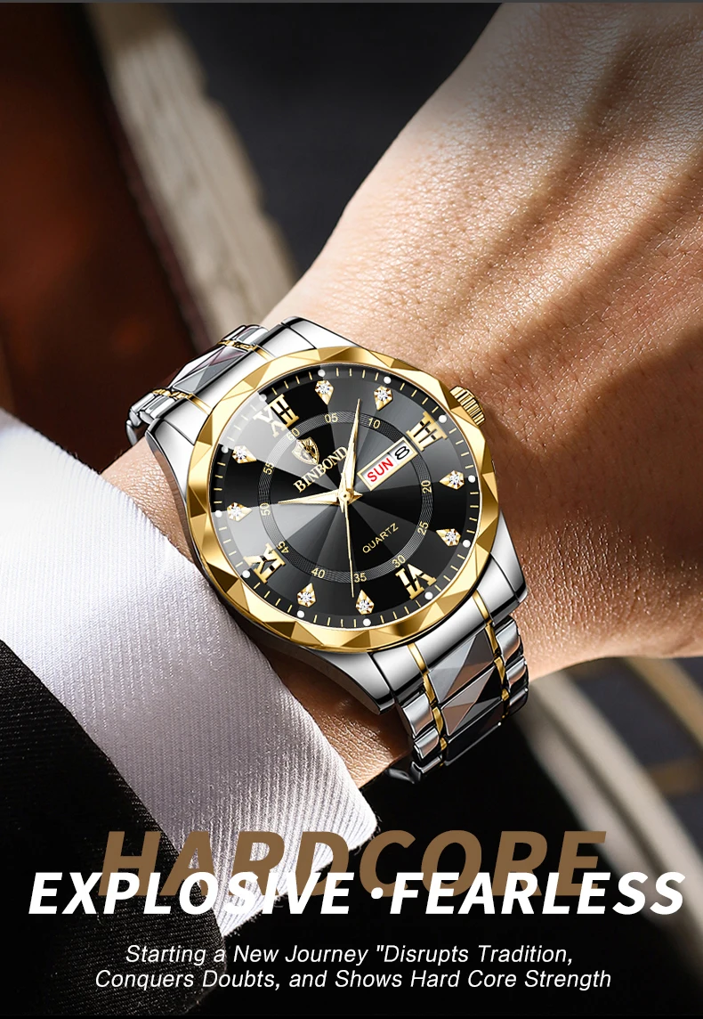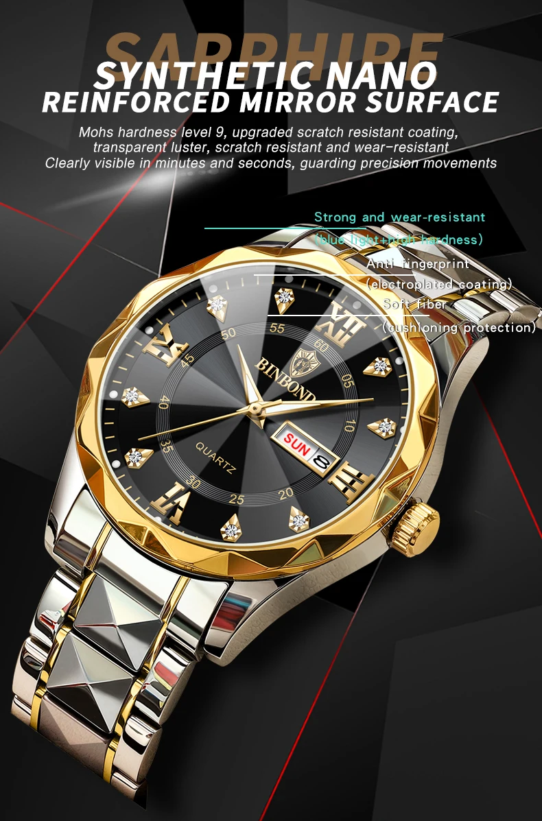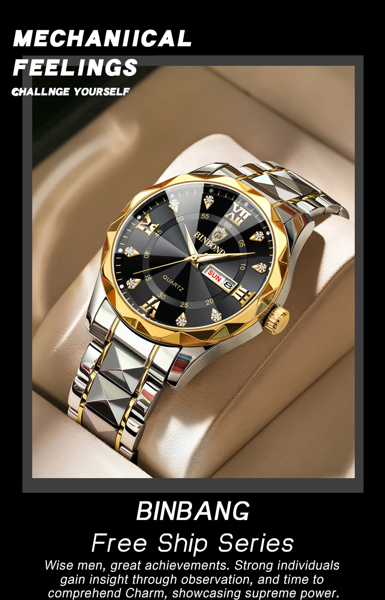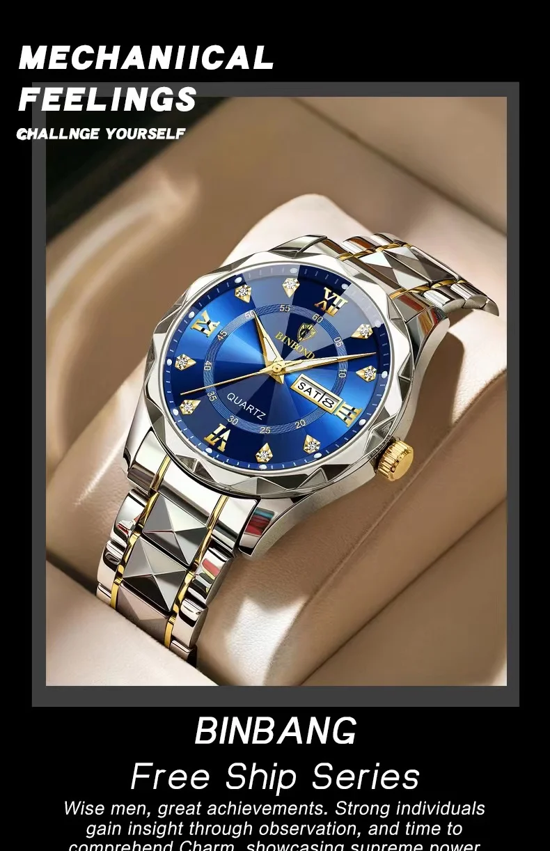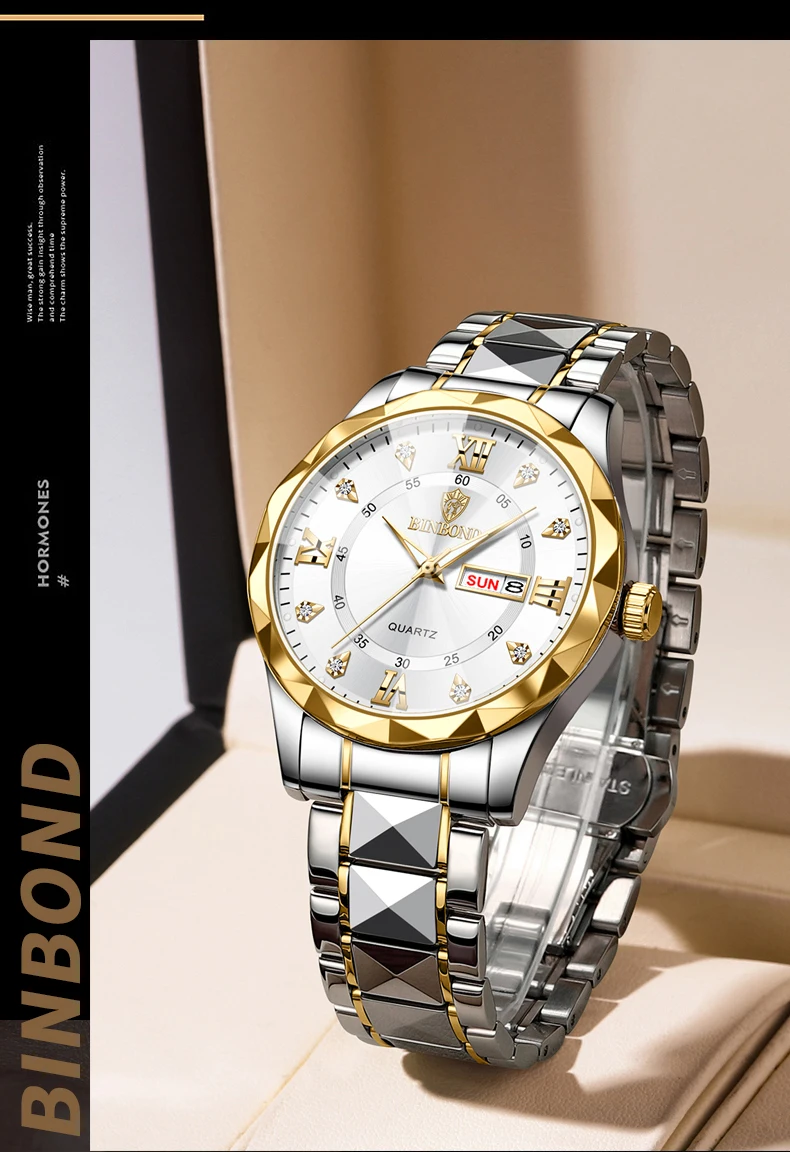 BINBOND Fashion New Men Business Watch Leisure Quartz Stainless Steel Buckle Watches Waterproof Luminous Calendar Men's Watches
