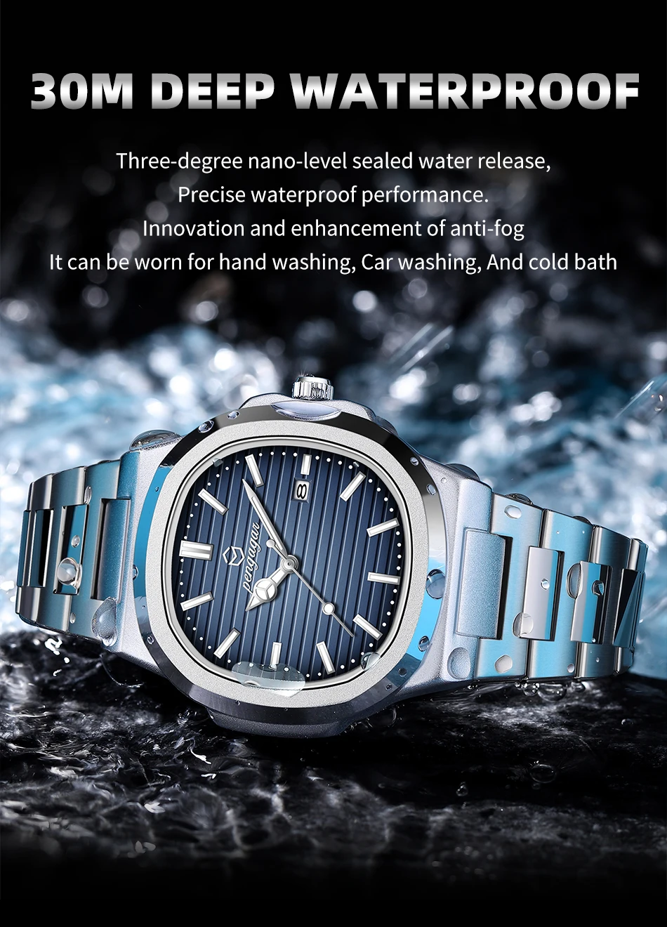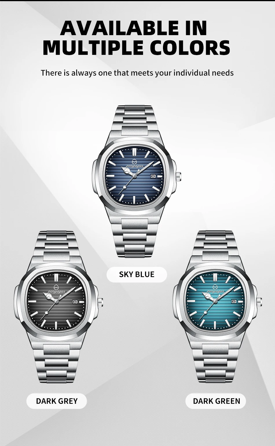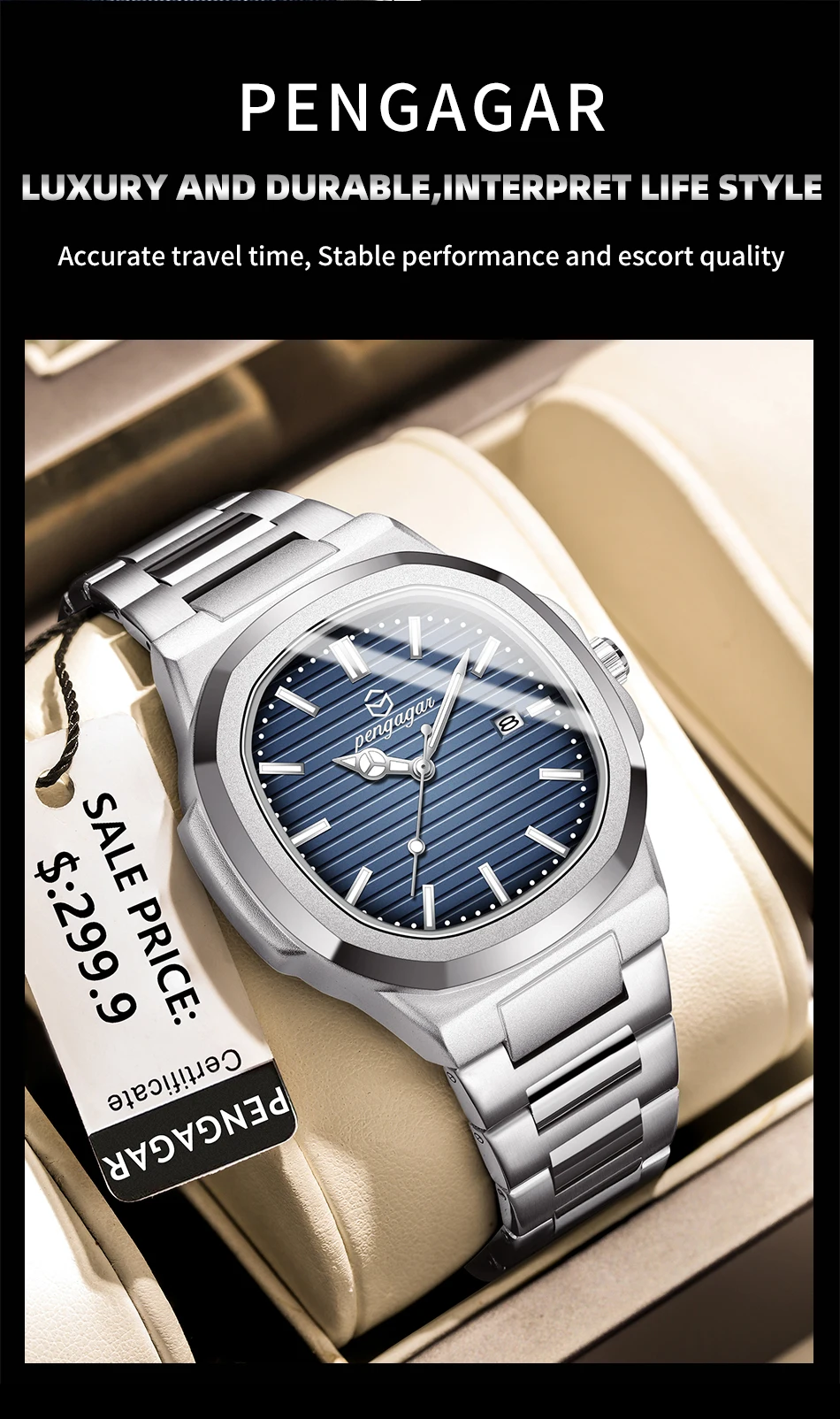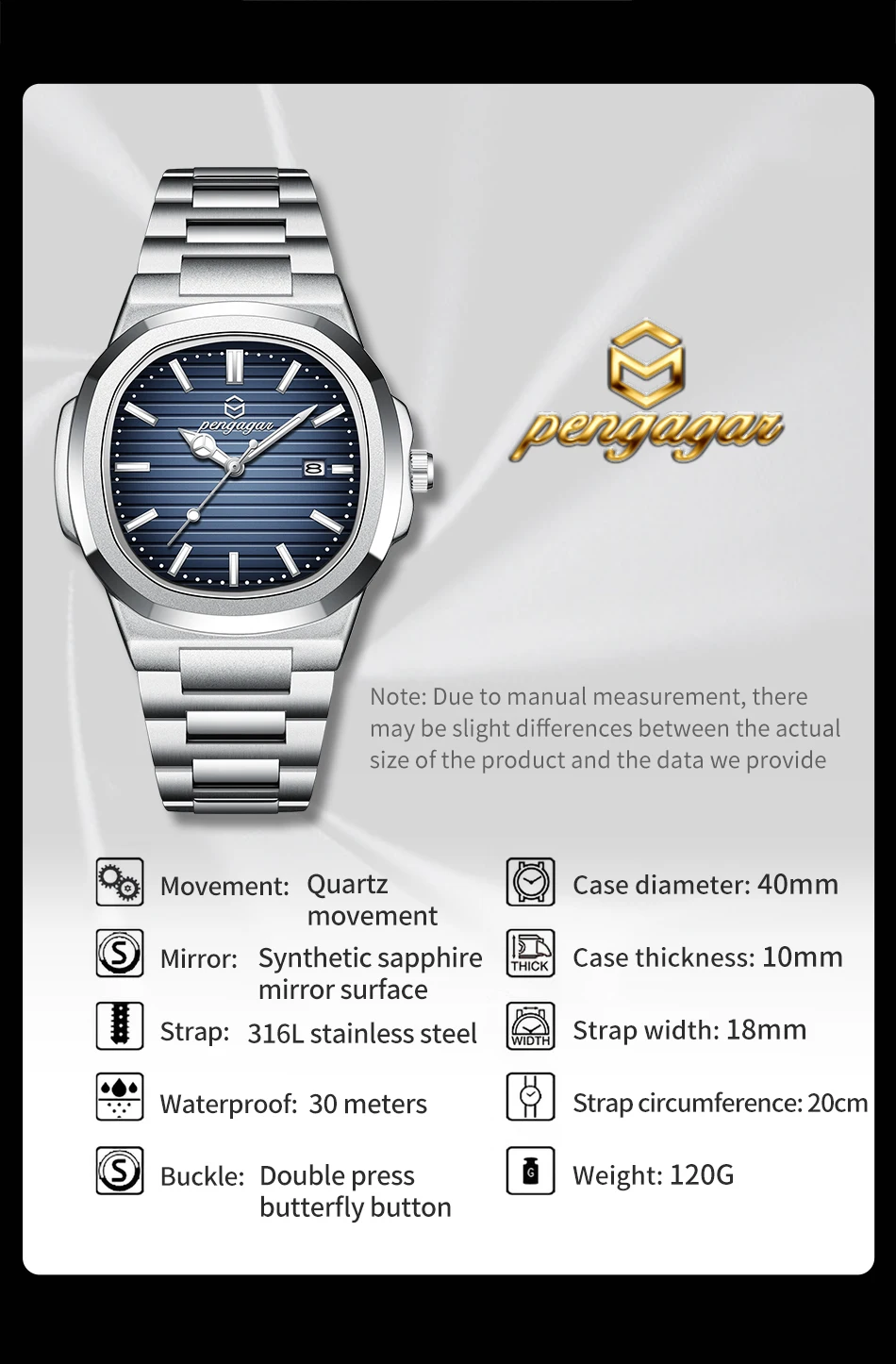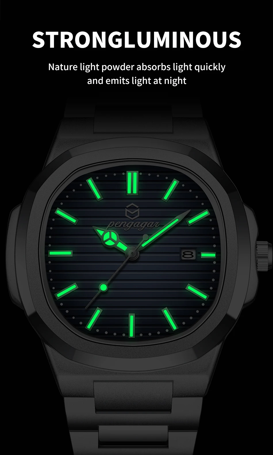 PENGAGAR Luxury Square Fashion Man Wristwatch Waterproof Luminous Date Week Quartz Men's Watches Stainless Steel Men Watch Reloj